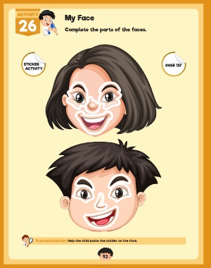 ACTIVITY My Face 26 Complete the parts of the faces. STICKER PAGE 137 ACTIVITY To parents/teacher: Help the child paste the sticker on the face. 92